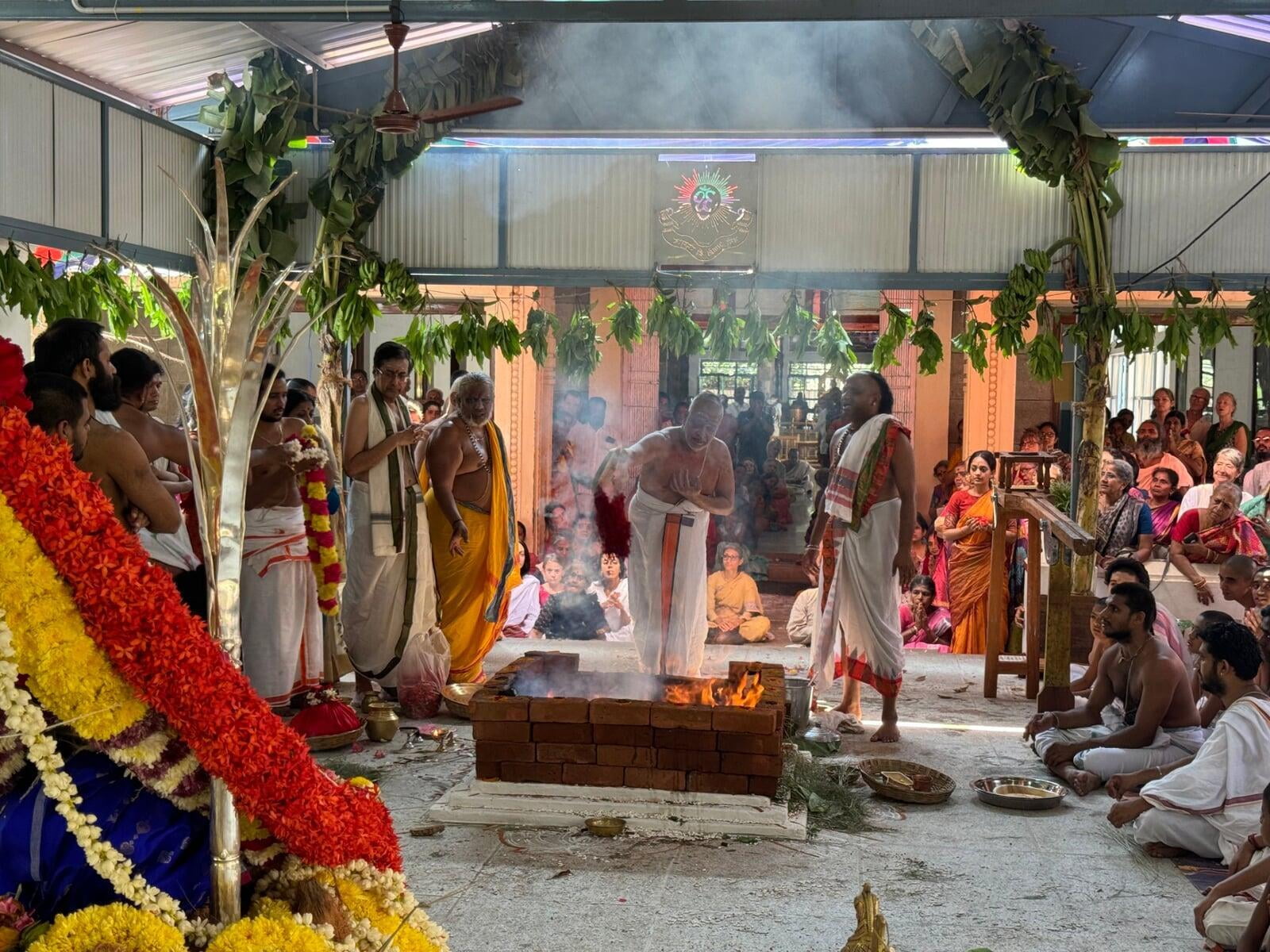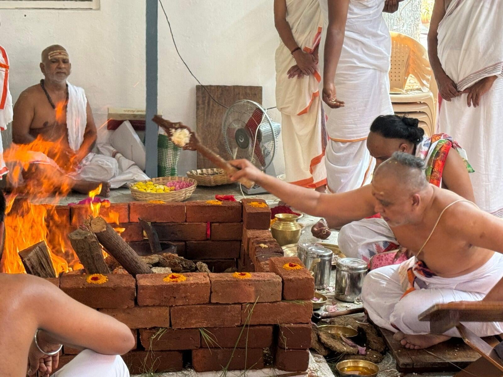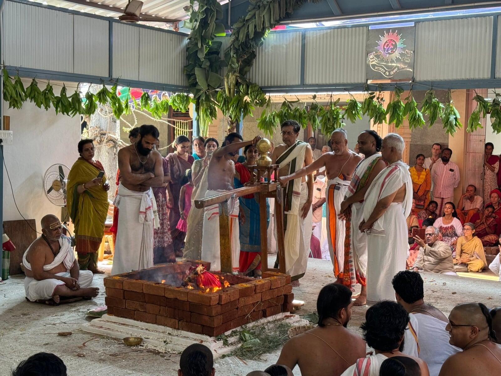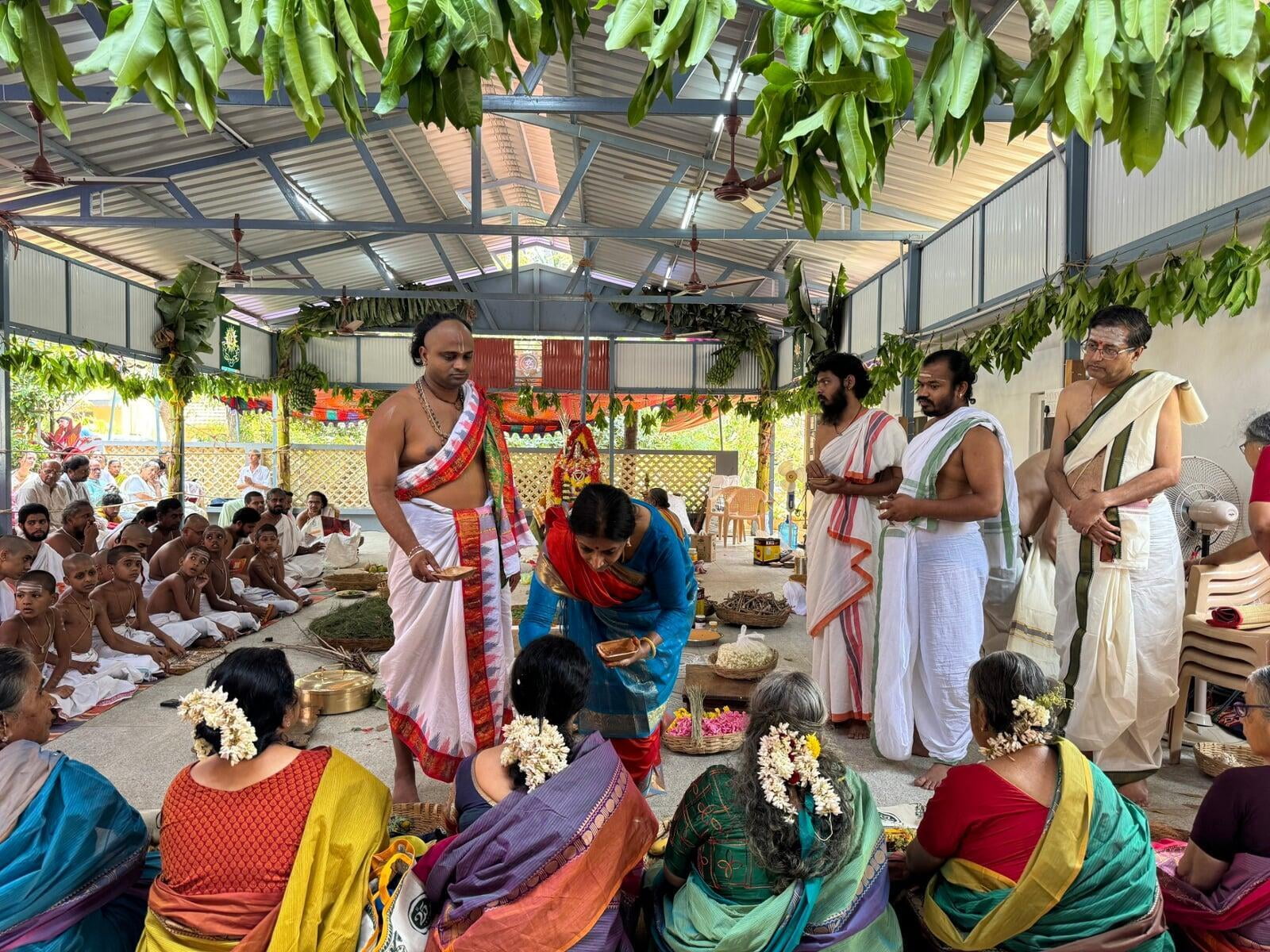 The annual Sri Vidya Homa took place at Sri Ramanasramam with grandeur on March 15, 2024. The event drew the participation of several thousand devotees. Commencing at 7 am, the day's rituals included the Navaavarna Puja, Homam, Sumangali Puja, Kanya Puja, Purnaahudi, and Deeparadhana. Following these ceremonies, the sacred tirthas were collected in urns and used for anointing the Sri Chakra Meru. The Deeparadhanas unfolded at the temples of Bhagavan (Ramaneswara) and his Mother (Mathrubhuteswara) around 3 pm.