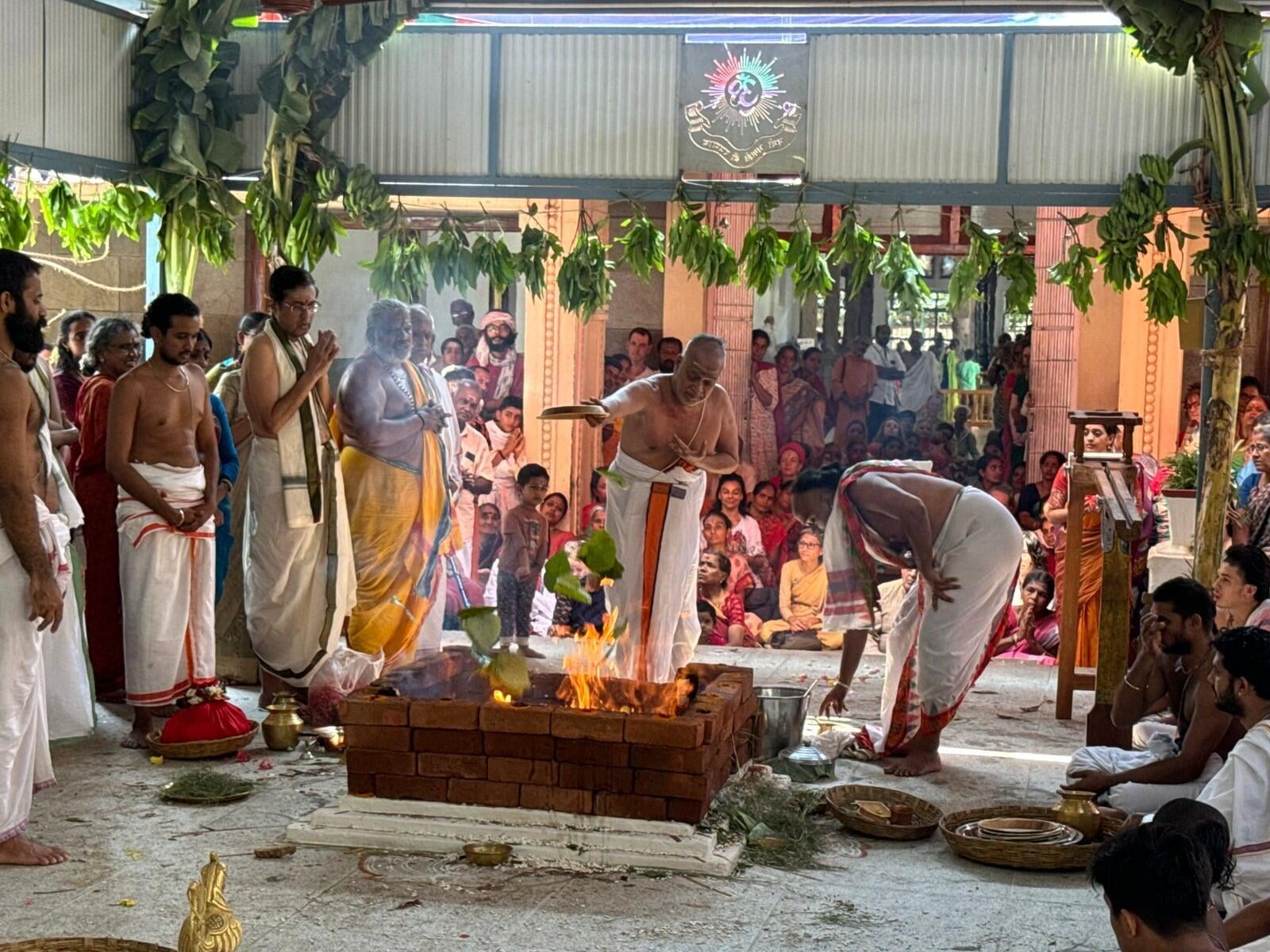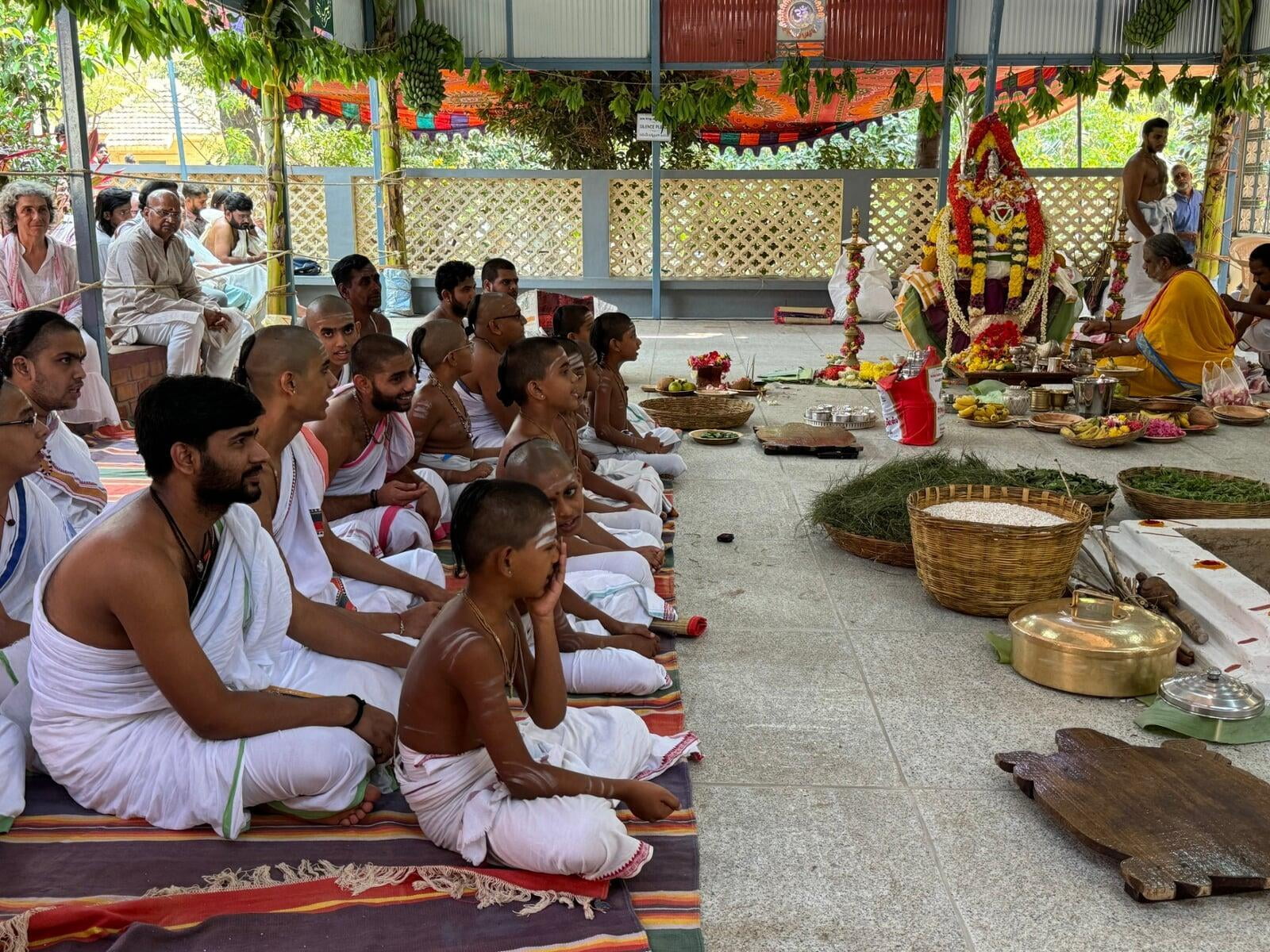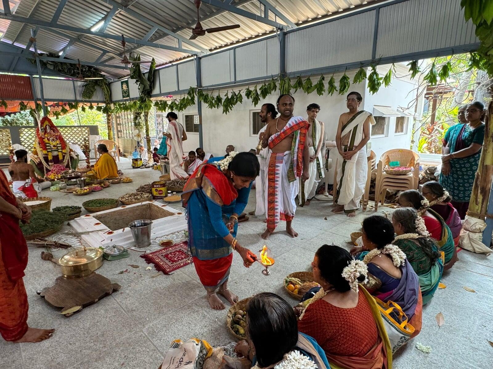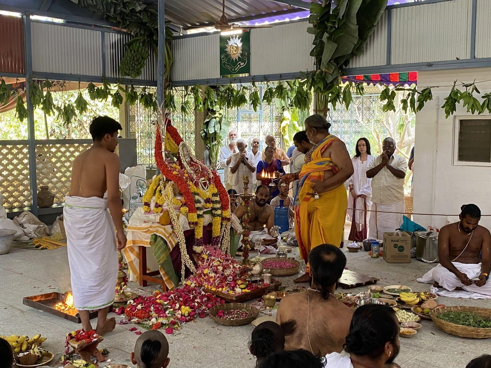 The annual Sri Vidya Homa took place at Sri Ramanasramam with grandeur on March 15, 2024. The event drew the participation of several thousand devotees. Commencing at 7 am, the day's rituals included the Navaavarna Puja, Homam, Sumangali Puja, Kanya Puja, Purnaahudi, and Deeparadhana. Following these ceremonies, the sacred tirthas were collected in urns and used for anointing the Sri Chakra Meru. The Deeparadhanas unfolded at the temples of Bhagavan (Ramaneswara) and his Mother (Mathrubhuteswara) around 3 pm.