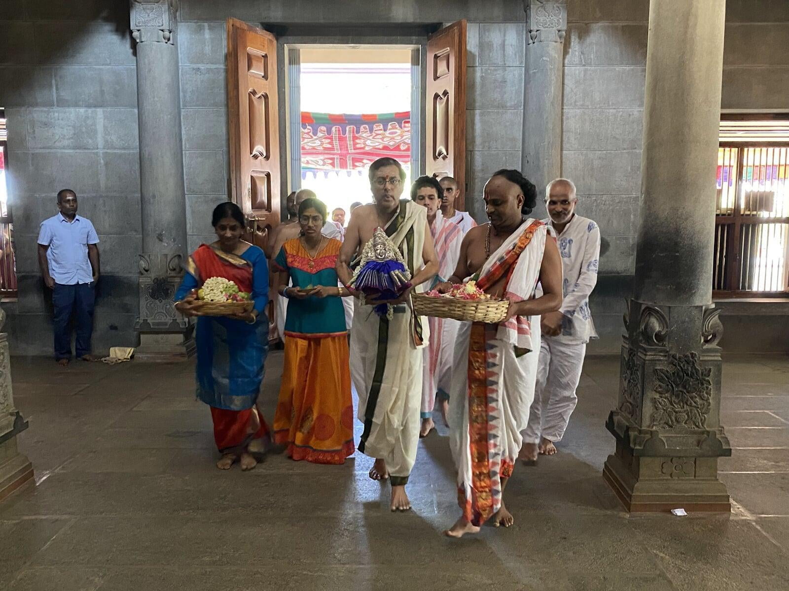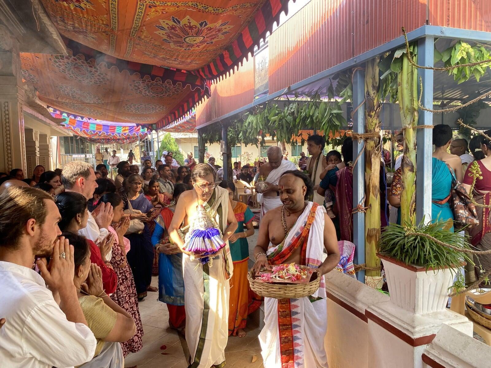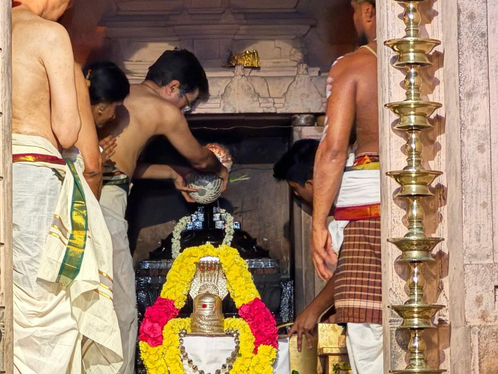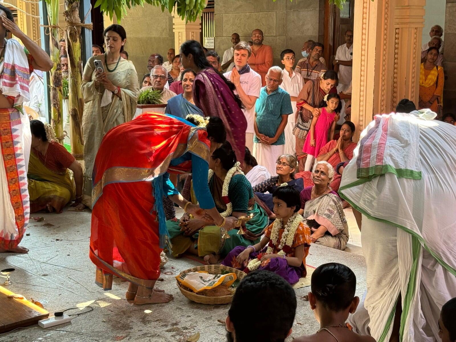 The annual Sri Vidya Homa took place at Sri Ramanasramam with grandeur on March 15, 2024. The event drew the participation of several thousand devotees. Commencing at 7 am, the day's rituals included the Navaavarna Puja, Homam, Sumangali Puja, Kanya Puja, Purnaahudi, and Deeparadhana. Following these ceremonies, the sacred tirthas were collected in urns and used for anointing the Sri Chakra Meru. The Deeparadhanas unfolded at the temples of Bhagavan (Ramaneswara) and his Mother (Mathrubhuteswara) around 3 pm.